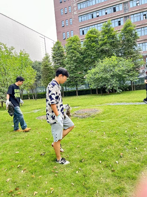 最后,党支部成员们在电气馆楼下的草坪上开始捡拾垃圾。大家戴上一次性手套,拿着垃圾袋,弯腰捡起散落在草坪上的纸屑、塑料瓶、烟头等各类垃圾,支部成员们仔细搜寻,不放过任何一个角落,确保草坪恢复整洁和美丽。