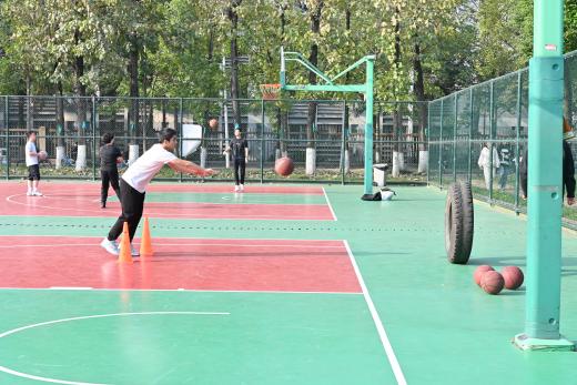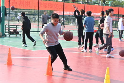 接着,辅导员邹伟豪老师对挑战赛的具体规则进行讲解,每位参与挑战的同学必须通过四个关卡:第一关为运球绕障碍桶S型前进,在此过程中不能将球运掉或碰倒障碍桶;第二关为在障碍桶面前完成变向后上篮;第三关为在固定的点位将球投出,需要让球穿过放在固定位置的轮胎;最后一关是站在罚球线处进行投篮。