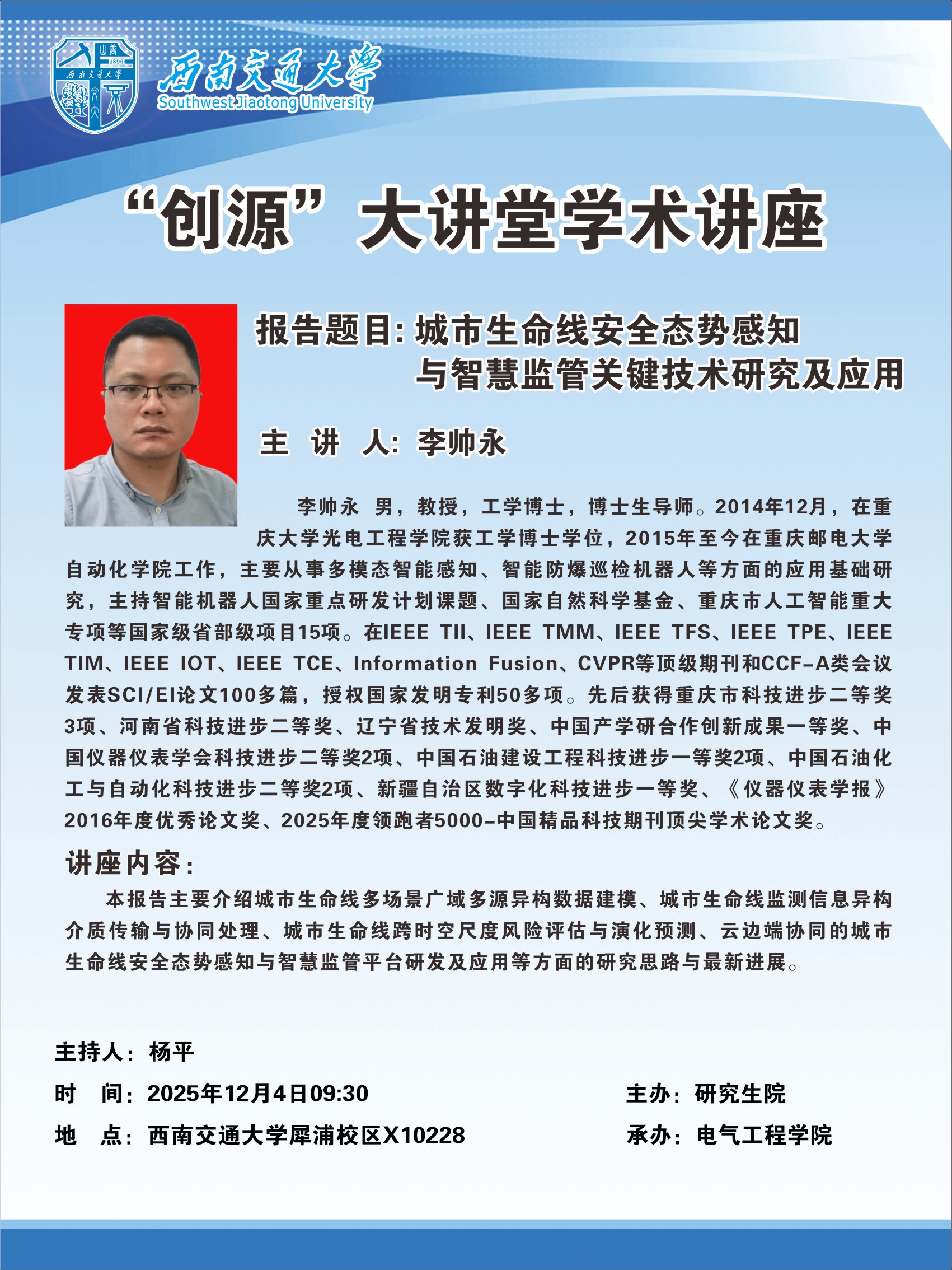 12月4日“创源”大讲堂:城市生命线安全态势感知与智慧监管关键技术研究及应用