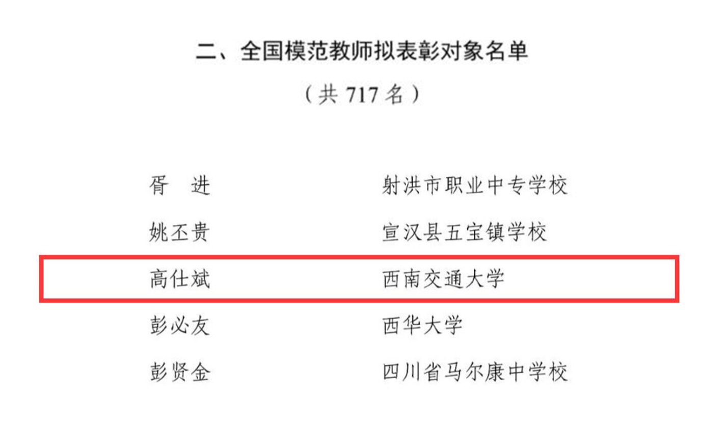 教授高仕斌获评全国模范教师。30多年来,他始终扎根科研和教学一线,专注于国家轨道交通供电领域科技创新和人才培养,突破多项技术难关,坚持科研育人、课程育人,为我国轨道交通电气化事业发展作出了突出贡献,为国家建设培养了大量优秀人才。